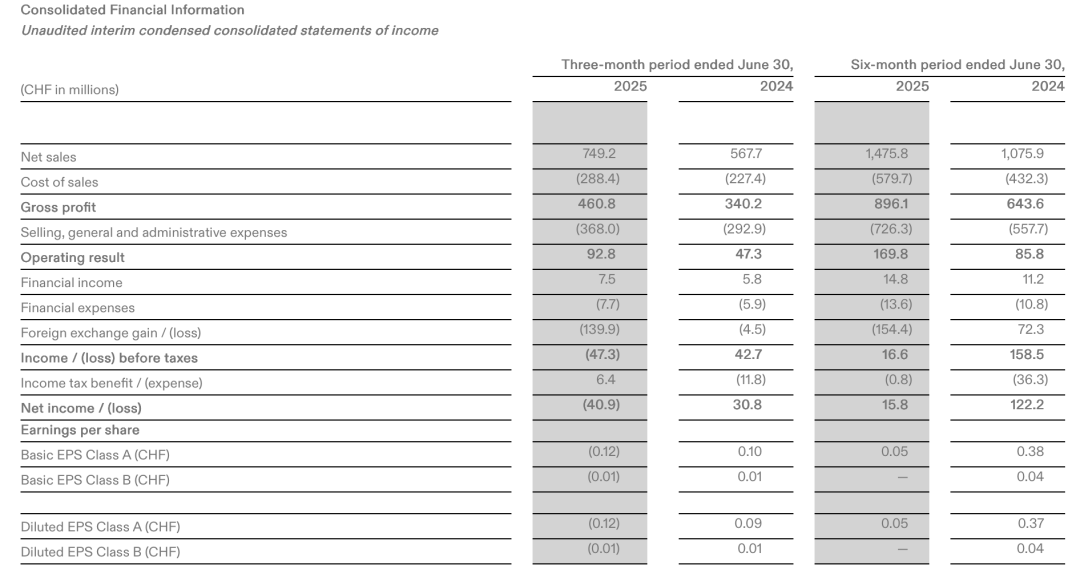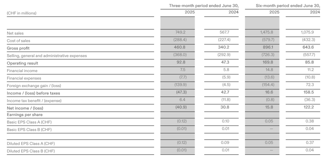 但需要注意的是,从今年的数据看,昂跑的盈利能力不比从前。2025年二季度,在净销售额保持高速增长的情况下,昂跑净利润却大跌232.7%,由去年同期的盈利3080万瑞士法郎(约合人民币2.74亿元)转为亏损4090万瑞士法郎(约合人民币3.64亿元);净利率直接由正转负,从5.4%下滑至-5.5%。