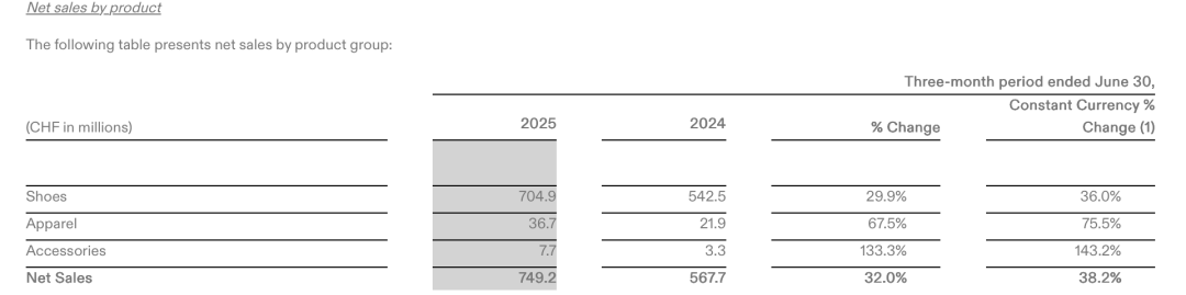 最新财报显示,2025年二季度,昂跑净销售额同比增长32%至7.49亿瑞士法郎(约合人民币66.71亿元),按不变汇率增长38.2%。