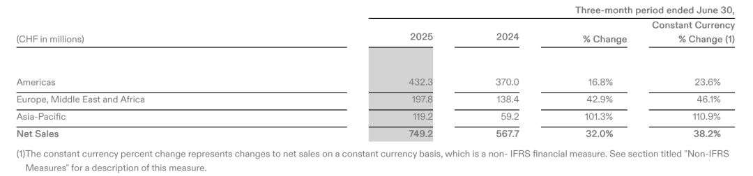 报告期内,昂跑在欧洲、中东和非洲(EMEA)、美洲和亚太地区的净销售额分别增长了42.9%至1.98亿瑞士法郎(约合人民币17.63亿元)、16.8%至4.32亿瑞士法郎(约合人民币38.47亿元)和101.3%至1.19亿瑞士法郎(约合人民币10.6亿元)。
