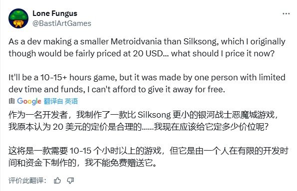 一位正在开发同类小体量类银河恶魔城游戏的独立开发者公开表达了担忧:“我原本计划将自己的游戏定价为20美元,但《丝之歌》的定价让我陷入两难。”这位单人开发者表示,其作品虽然能提供10-15小时的游戏体验,但受限于开发资源和成本,无法承受过低定价。