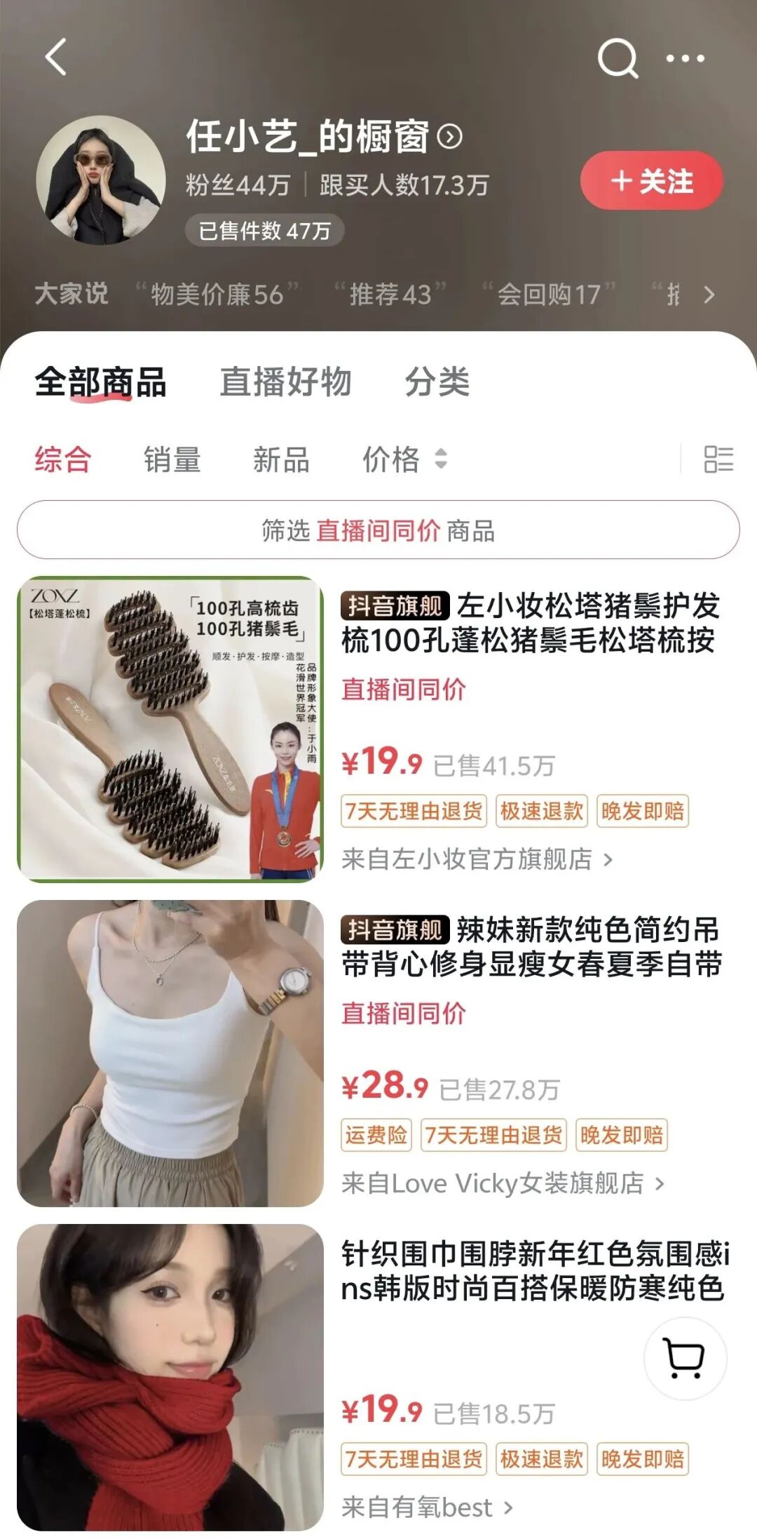值得注意的是,除淘宝外,任小艺还在抖音、小红书同步开设店铺,而从销量与粉丝量来看,淘宝店铺仍是其主要经营阵地。