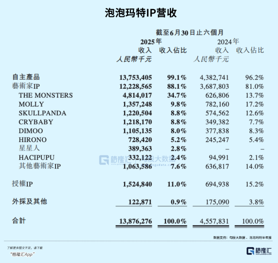 2025年上半年,泡泡玛特自主产品收入占比高达99.1%,其中艺术家IP收入占比88.1%,共有13个艺术家IP收入过亿。