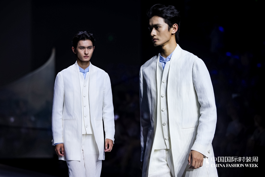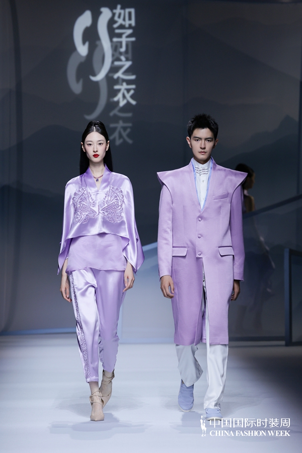 整场大秀层次分明,且绝妙递进,聚焦传统意向为三大篇章:天、地、人,愿有所承,系列以“天愿”“地愿”“人愿”为三大视觉章节,分别对应宇宙、自然与人文,结构清晰且意蕴深长。“天愿”系列选用老真丝、丝毛混纺等矜贵面料,以深邃蓝、神秘紫与纯粹白为主调,隐喻浩渺苍穹与星宿流转。刺绣纹样萃取自汉代星云纹与凤鸟纹,以细腻打籽绣、盘金绣工艺点缀于衣领、袖口,风格低调却极具精神意蕴;“地愿”则回归大地质朴之感,丝麻、柞蚕丝、棉麻以及提花香云纱成为主角。自然绿与纯净白相互交融,呼应万物生长的本真状态。图案源自大地生灵图腾,经设计师抽离与几何化重构后,兼具传统底蕴与当代美感,仿佛让衣物自身生长出带呼吸感的生命力;“人愿”章节最具前瞻态度,聚焦天丝麻、再生尼龙、人造丝等环保科技面料,在灰绿、灰蓝与白灰的冷调中透出清净未来感。汉代陶器与织锦中的曲线纹样,被转化为具有现代感的印花与镂空刺绣,既减轻视觉重量,也彰显实穿与可持续并重的设计伦理。