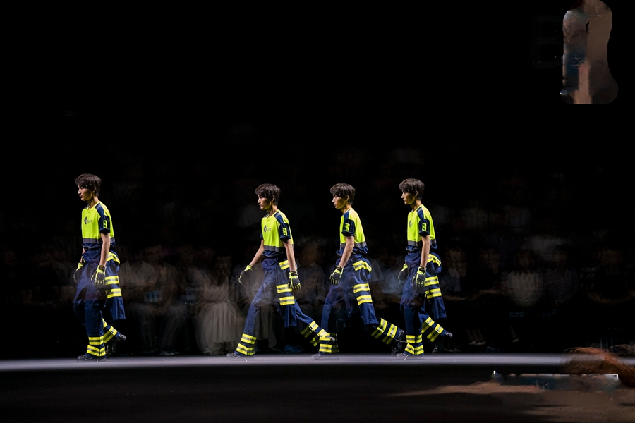 “四时之续”则以极具张力的舞台语言,呈现工装在极端环境下的功能与人文双重属性。通过模拟酷热与严寒的舞台置景,让观众身临其境感受工装在严苛环境中的的功能属性。展演过程中模特以动态劳作场景完成舞台表演,生动展示了工装在真实劳作环境中的运用场景,诠释了品牌对功能与关怀共生的产品追求。