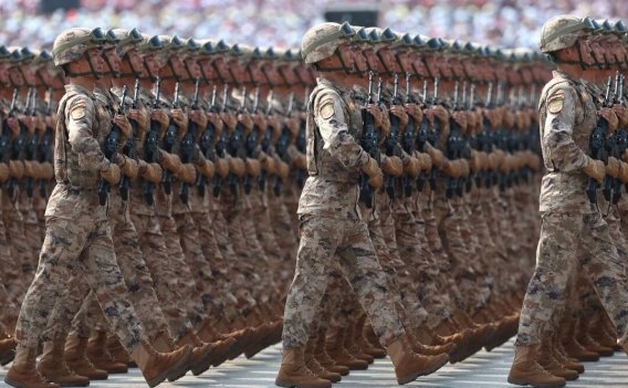 (上图为:预备役部队方队将士身着际华3534公司制19阅兵荒漠迷彩通用作战服产品接受检阅)