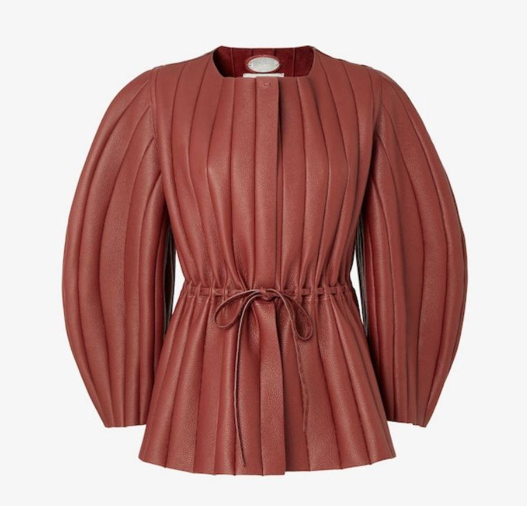 圆领茧型长袖夹克,无衬里,铁锈色鹿皮材质,工艺灵感源自标志性Pequin图案。垂直拼接结构,饰醒目缝线,重现典型的风琴褶效果。