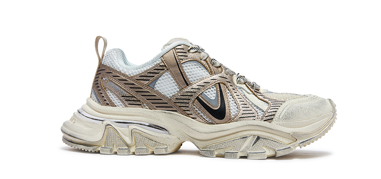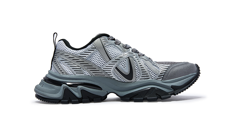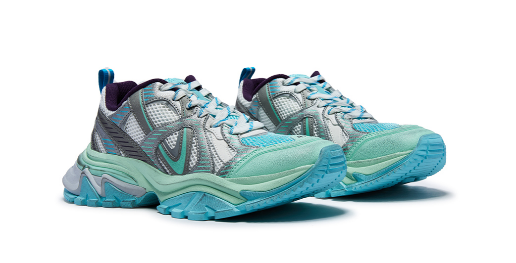 V2000MAX延续了品牌标志性的复古风格,同时融入未来感设计元素。其鞋型设计在V2000的基础上MAX升级,前脚掌翘起幅度更大,走路发力更轻松脚感更好。鞋面采用交错的V型线条与网面材质,结合多色配色方案,呈现出强烈的视觉辨识度。这一设计不仅延续了VETEMENTS一贯的街头实穿主义风格,更通过细节处理与材质选择,展现品牌对细节的极致追求。