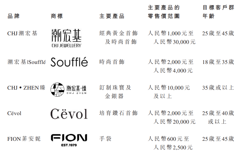 翻开招股书,潮宏基将自己定义为一家深耕东方文化的珠宝品牌,致力于国家非遗花丝技艺。以主要品牌CHJ潮宏基为基础,公司旗下还有潮宏基|Soufflé、CHJ·ZHEN臻,以及新培育钻石品牌C?vol,还有新收购的时尚手袋品牌FION菲安妮——以此划分为珠宝和手袋两大业务。
