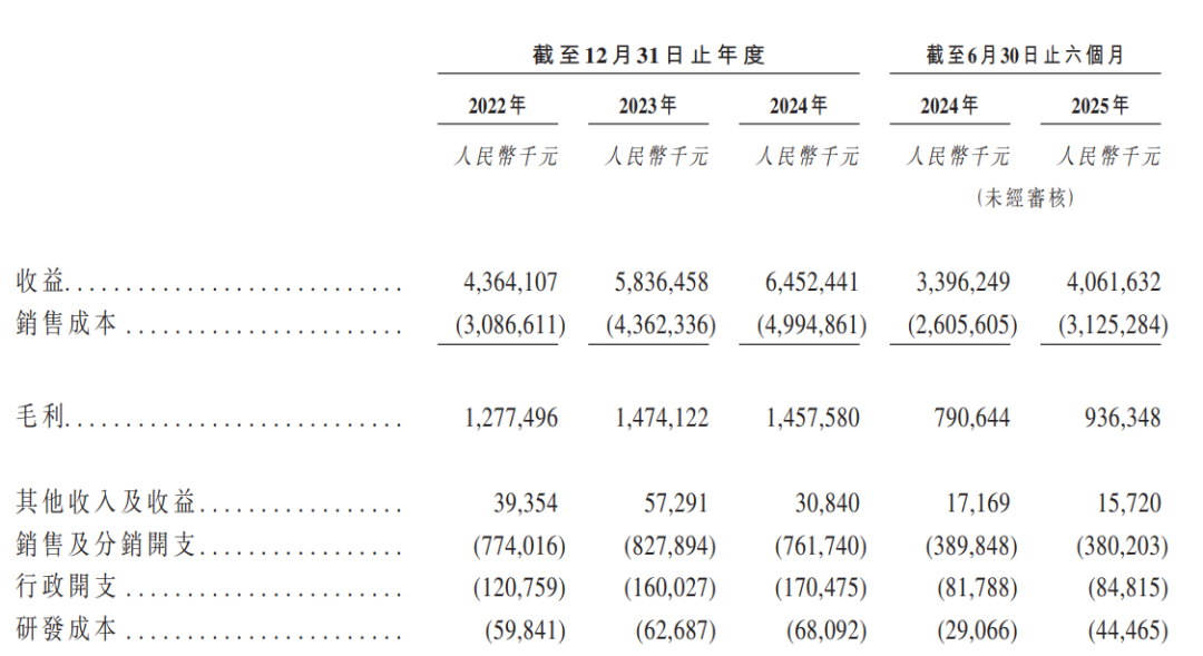 招股书显示,2022年至2024年及2025年前六个月,公司营收分别为43.64亿元、58.37亿元、64.52亿元,及40.62亿元,前三年复合年增长率达21.6%。