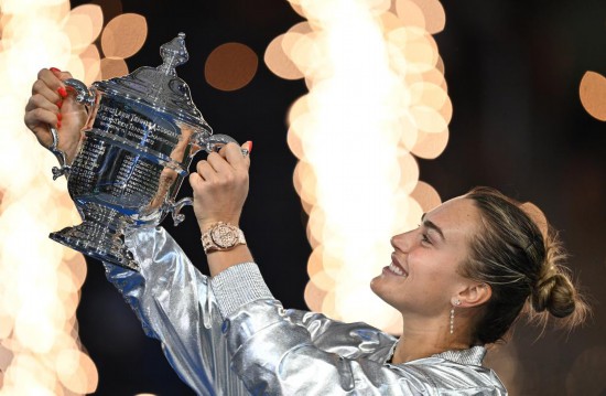 9月6日,萨巴伦卡在颁奖仪式上。当日,在2025美国网球公开赛女子单打决赛中,白俄罗斯选手萨巴伦卡2比0战胜美国选手阿尼西莫娃,获得冠军。新华社记者 李睿 摄