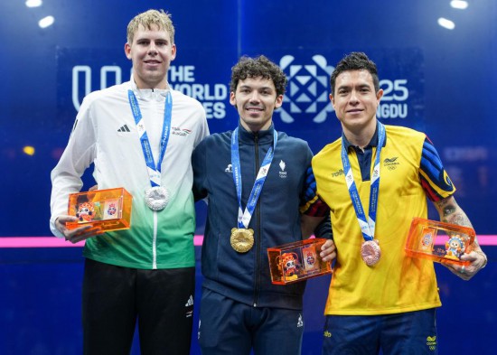 8月12日,匈牙利选手鲍拉日(左)在成都世运会壁球男子单打颁奖仪式上。新华社记者 李旭伦 摄